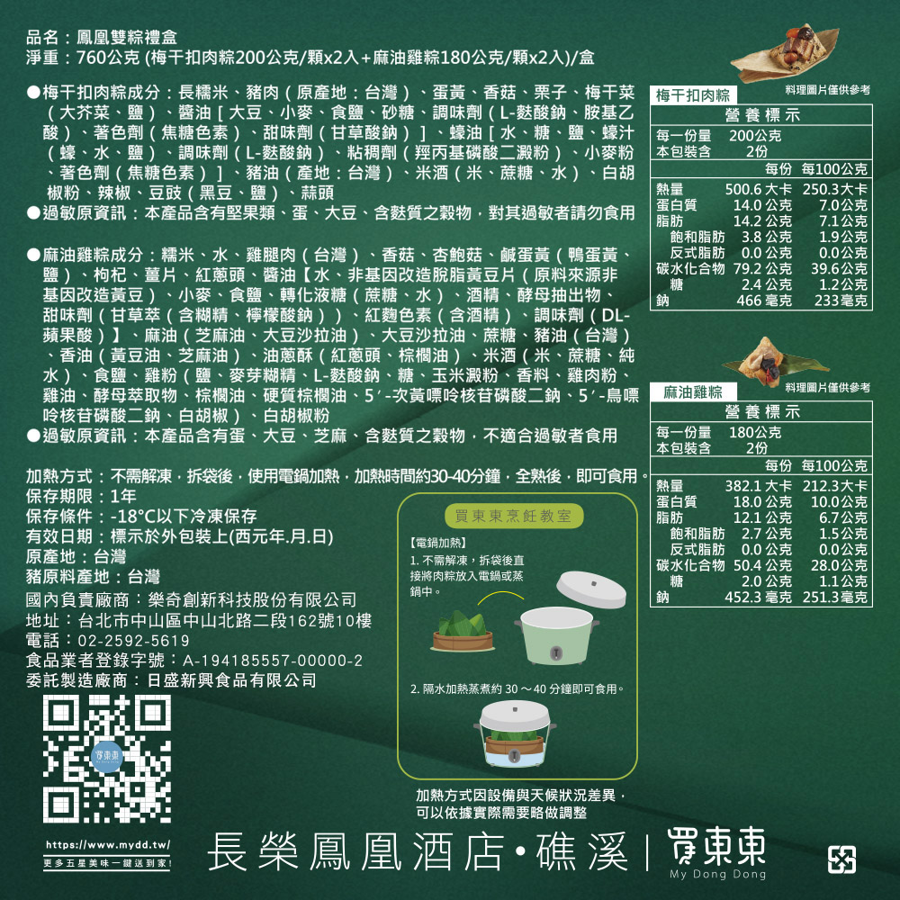 1.商品組合/規格:【長榮鳳凰酒店.礁溪】鳳凰雙粽禮盒(4入/盒)