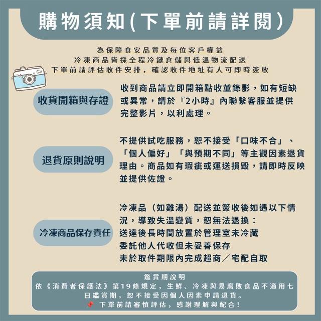 5.因該商品屬性特殊、保存期限及衛生考量,不在七天鑑賞期之規範內,若因個人因素(訂購人所提供的資料不完整等情況)造成商品無法即時送達,恕不接受取消訂單、退貨與退款,請於收到出貨通知後注意陌生電話,物流公司將主動與您連繫送貨事宜。